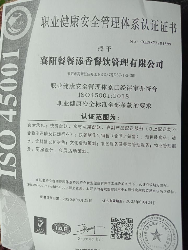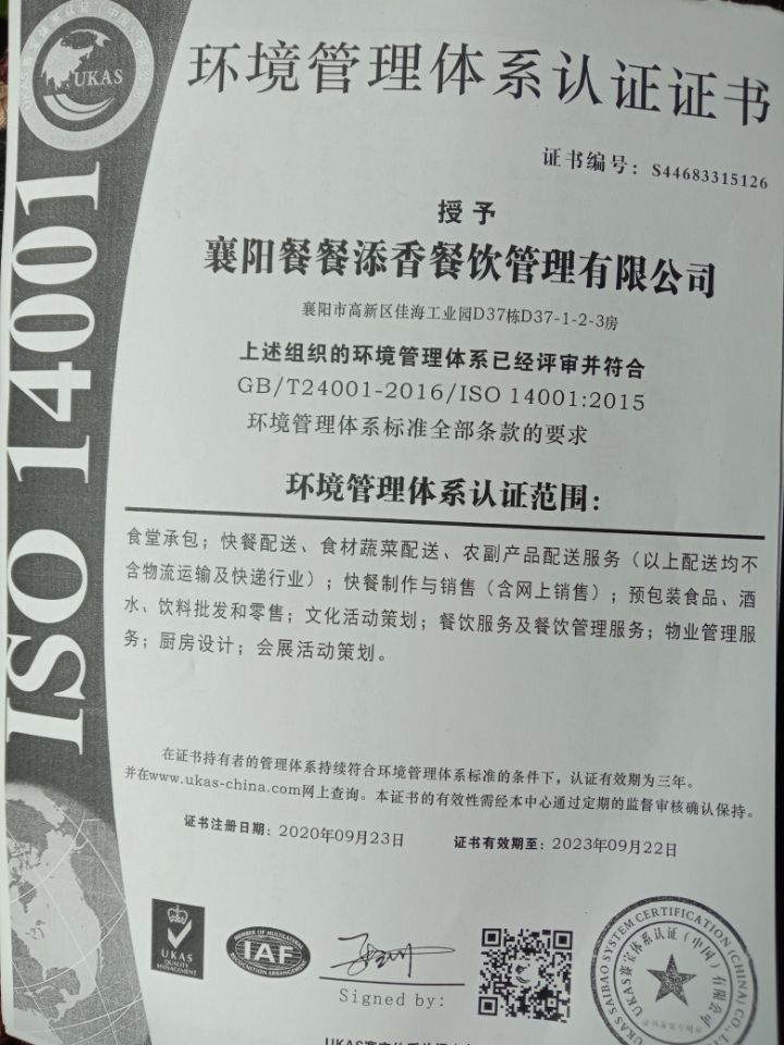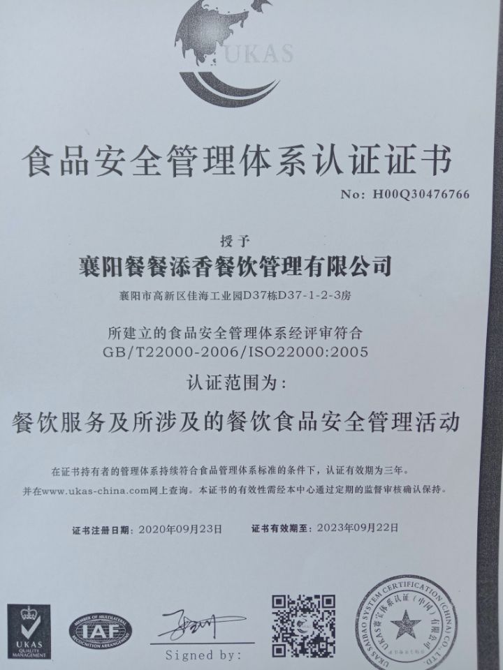 食品安全管理體系認(rèn)證證書